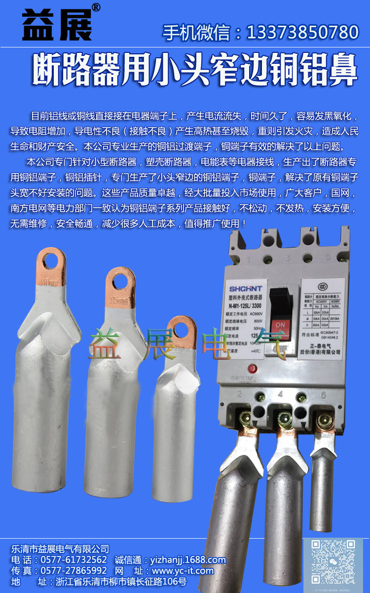 | 益展牌小頭銅鋁線鼻子,DTLX-35斷路器專用線鼻子,小頭銅鋁端子,各種銅鼻子,雙孔銅鼻子,銅鋁過渡線鼻子,SC窺口線鼻子,雙孔銅鋁鼻子,冷熱縮電纜附件,穿刺線夾,堵油銅鼻子,冷壓端子,C45插針,OT開口鼻子,管型冷壓端頭,銅鋁線夾,接線端子,接插件,壓線帽,等各系列配線器材 |
